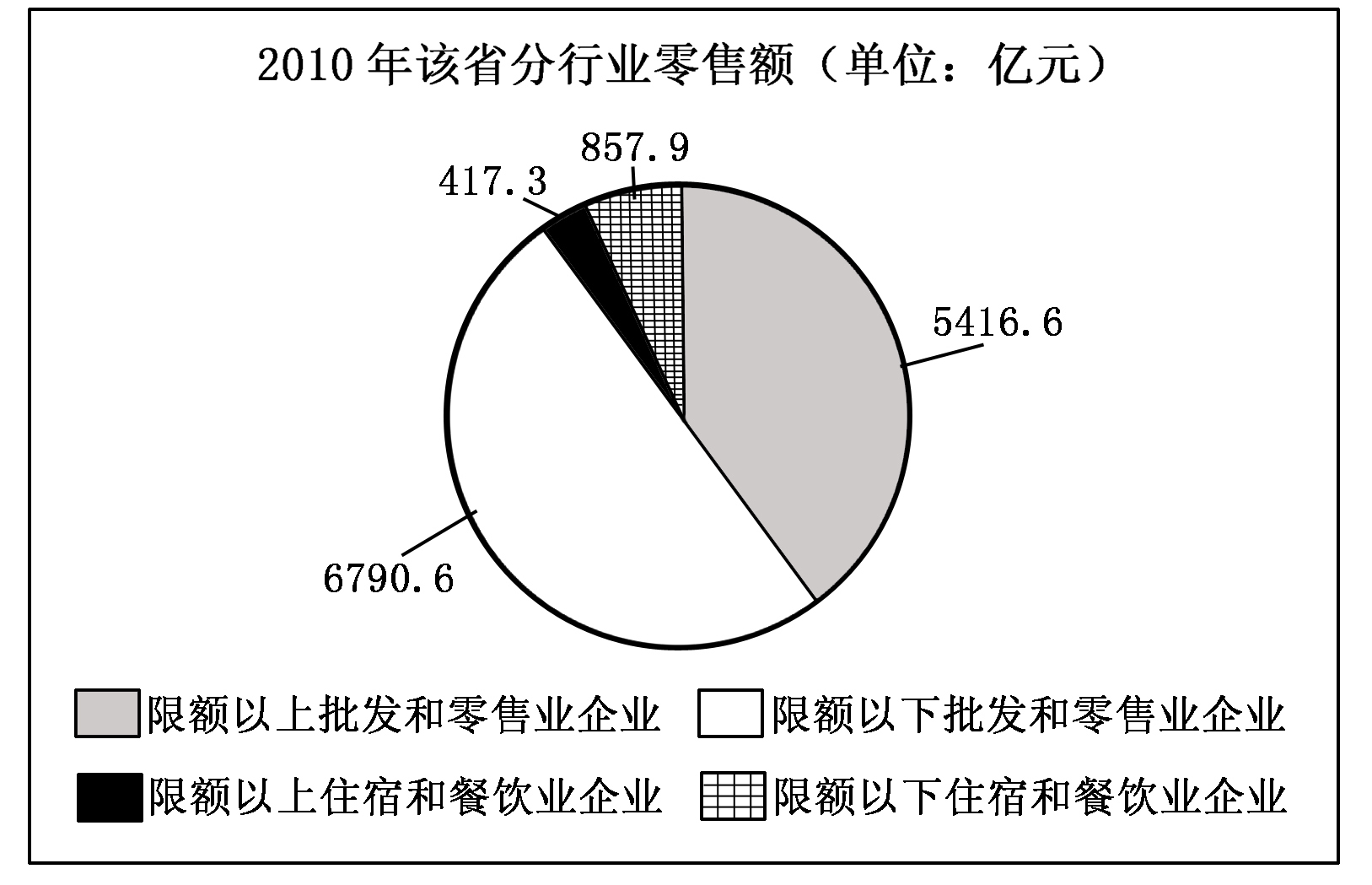 所给出的图、表、文字或综合性资料均有若干个问题要你回答。你应根据资料提供的信息进行分析、比较、计算和判断处理。一、根据以下资料,回答101~105题。 ![]() 101.A0级型车比A00级型车在过去的五年中每年平均销售份额约高出: A.15个百分点 B.14个百分点 C.16个百分点 D.17个百分点 102.相对于2001年,2010年的销售份额增长率最大的车型是: A.A级型车 B.B级型车 C.AO级型车 D.AOO级型车 103.2001~2010年各级别轿车历年销售份额的变化趋势正确的是: A.近十年来,C级型车销售份额最平稳 B.B级型车销售份额逐年减小 C.A00级型车的销售份额始终是C级型车销售份额的2倍以上 D.2010年A0级型车的销售量相比于2001年减少 104.因1.6升购置税调整,A级型车市场从2008年到2009年的同比上升率相对于B级型车同比下降率的比值约为: A.0.4 B.O.3 C.O.5 D.0.6 105.B级型车与C级型车相比,比值最大的年份与比值最小的年份相比,比值相差: A.2.64 B.2.84 C.3.56 D.2.44 二、根据以下资料,回答106~110题。 2010年1~3月,法国货物贸易进出口总额为2734.4亿美元,同比增长13.4%。其中,出口1264.7亿美元,同比增长14.5%;进口1469.7亿美元,同比增长12.4%;逆差205.0亿美元,同比增长1.0%。 1~3月,中法双边贸易额为142.7亿美元,同比增长22.4%。其中,法国对中国出口32.1亿美元,同比增长43.5%;自中国进口110.6亿美元,同比增长17.4%;法国逆差78.5亿美元,同比增长9.3%。中国在法国主要出口伙伴中排名第九位、在法国的主要进口来源地中居第四位。 1~3月,法国对中国出口的前三大产品为机电产品、运输设备和化工产品,出口额分别为9.8亿美元、8.4亿美元和4.0亿美元,同比分别增长14.9%、99.7%和25.9%,这三类产品出口额合计占法国对中国出口总额的( )。另外,与上年同期相比,1~3月法国对中国出口的塑料橡胶、皮革箱包、陶瓷玻璃和家具玩具的出品额增长显著,其中家具玩具的出口额增长最快,增幅达到190.9%。 1~3月,法国自中国进口的前三大类产品为机电产品、纺织品及原料、家具玩具。进口额分别为48.5亿美元、18.2亿美元和11.7亿美元,同比分别增长30.4%,3.6%和8.1%,在法国同类产品销售进口市场中的份额分别为16.8%,25.9%和30.8%,这三类产品销售1~3月进口额同比增长最快,为38.8%。 106.2010年1~3月,法国货物贸易出口额比上年同期增长了约多少? A.140亿美元 B.120亿美元 C.160亿美元 D.180亿美元 107.资料中括号处应填入的数字为: A.28.3% B.20.1% C.56.7% D.69.2% 108.2010年1~3月,法国对中国出口的各类产品中,出口额比上年同期增长最多的是: A.机电产品 B.运输设备 C.化工产品 D.家具玩具 109.2010年1~3月,法国纺织品及原料的进口额约为多少亿美元? A.70.3 B.67.8 C.99.1 D.108.3 110.关于2010年1~3月中法双边贸易情况的描述,以下说法与资料相符合的是: A.中国是法国最大的家具玩具进口来源地 B.中国机电产品对法贸易顺差高于上年同期 C.法国对中国出口额占其出口总额的4%以上 D.中法化工产品进出口贸易额同比增长了约20% 三、根据以下材料,回答111~115题。 2009年,某省全年粮食作物播种面积253.85万公顷,比上年增长1.5%;糖蔗种植面积13.58万公顷,下降0.2%;油料种植面积33.14万公顷,增长2.3%;蔬菜种植面积113.84万公顷,增长2.3%。 ![]() 111.以下三种作物按2009年亩产从高到低排序正确的是: A.糖蔗、蔬菜、油料 B.糖蔗、油料、蔬菜 C.蔬菜、油料、糖蔗 D.蔬菜、糖蔗、油料 112.下列作物2009年比2008年增产量最多的是: A.糖蔗 B.粮食 C.蔬菜 D.水果 113.2009年,海水养殖业产量占水产品养殖业的比重为: A.33.4% B.77.5% C.60.8% D.43.7% 114.若保持2009年的增长速度,哪一年水果的年产量开始超过糖蔗? A.2011年 B.2010年 C.2012年 D.2013年 115.能够从上述资料中推出的是: A.2008年,肉类和水产品总产量高于粮食产量 B.与上年相比,2009年肉类的增产量高于水产品的增产量 C.2009年,茶叶种植面积比上年有所增长 D.2009年,水产品捕捞业产量比上年有所下降 四、根据以下资料,回答应116~120题。 ![]() ![]() 116.以下说法正确的是: A.2010年该省社会消费品分月零售额增幅最大的是12月份 B.2009年该省社会消费品分月零售额最大的是12月份 C.2010年该省限额以上企业零售额大于限额以下企业零售额 D.2009年5月该省社会消费零售额为941.5亿元 117.已知2010年该省限额以下批发和零售企业零售额相比于2009年同期增幅为18.7%,那么2009年该省限额以下批发和零售企业零售额为: A.5720亿元 B.4563亿元 C.772亿元 D.351亿元 118.已知2010年限额以上企业零售额增幅为27.4%,限额以下企业零售额增幅为12.8%,那么2009年限额以上企业和限额以下企业零售额差值与2010年差值相比是: A.约多386亿元 B.约少386亿元 C.约多674亿元 D.约少647亿元 119.该省2010年社会消费品零售总额是: A.13482.4亿元 B.11959.6亿元 C.14852.6亿元 D.16347.2亿元 120.以下说法错误的是: A.2010年3月的零售额在12个月中是最小的 B.2010年1月的零售额增幅在12个月中是最小的 C.2010年批发零售业零售额占社会消费品零售总额的比重超过50% D.2010年限额以上企业零售额占社会消费品零售总额的比重超过50% 全部测验到此结束!